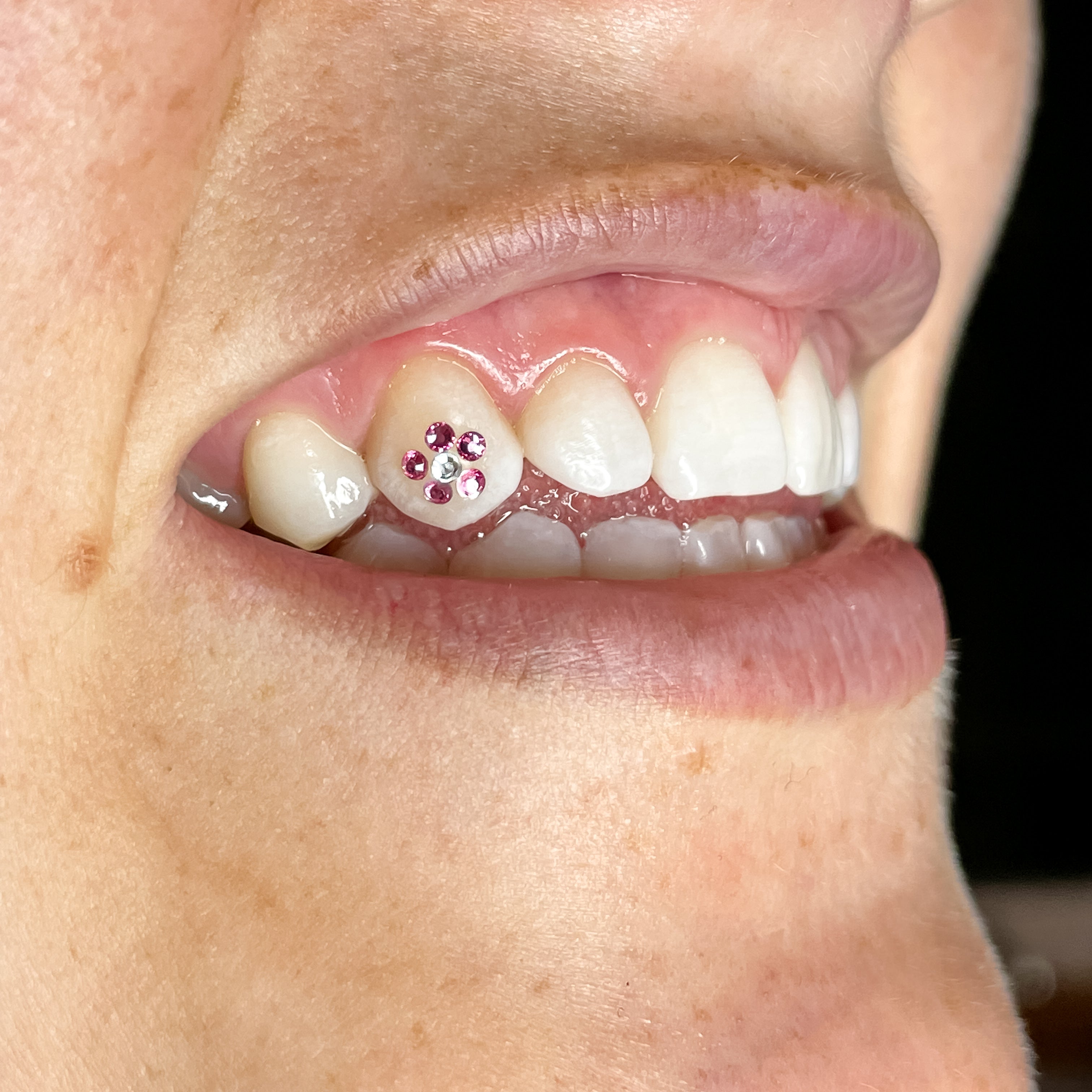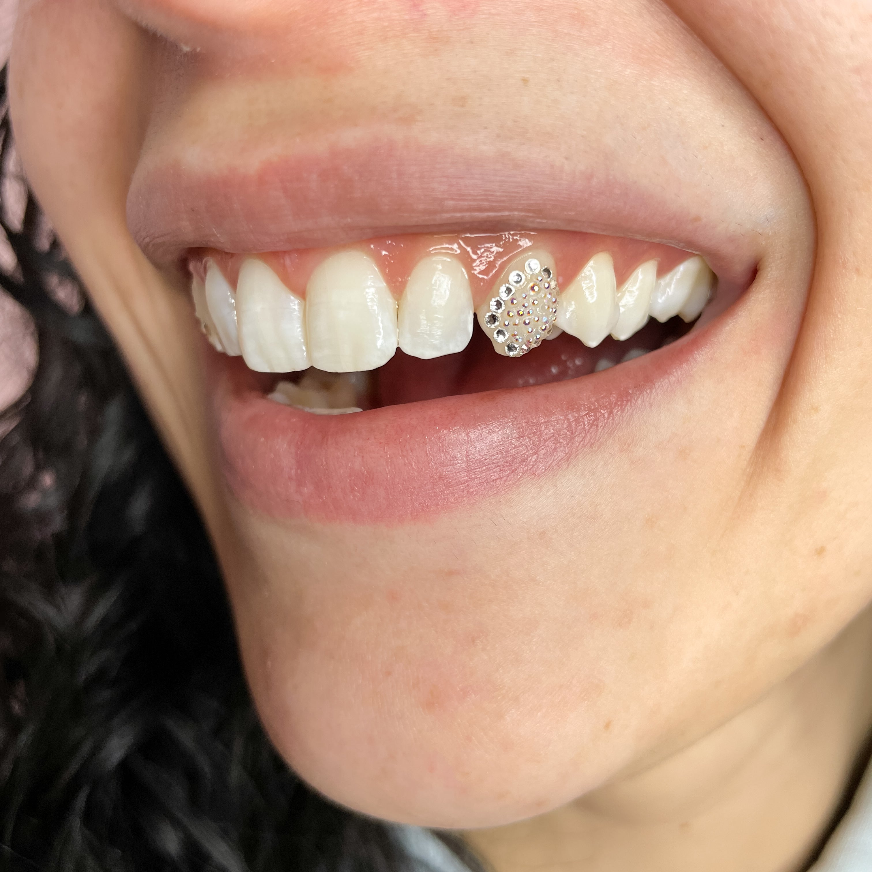 A custom crystal design consisting of four or more crystals, placed on one or multiple teeth. Designs begin at $160 and increase based on complexity. If you would like pricing prior to your appointment, please reach out.